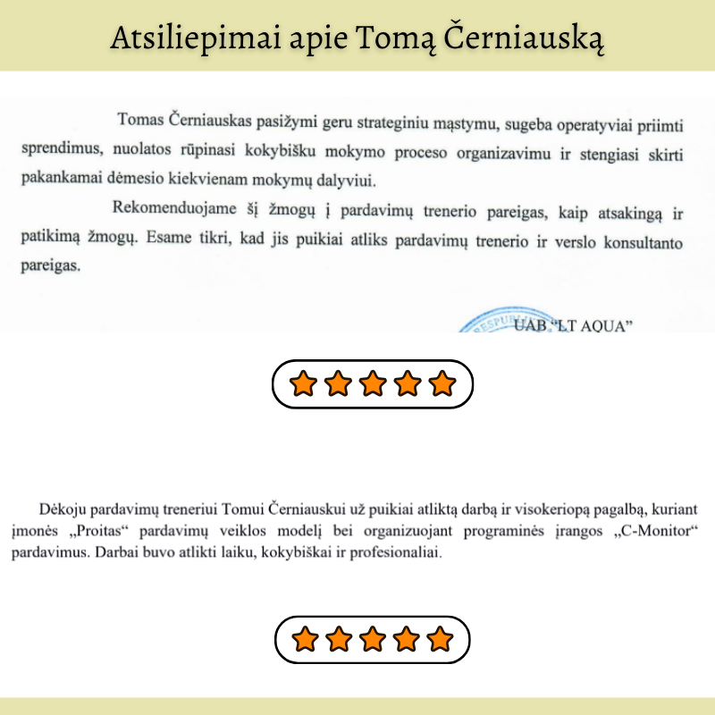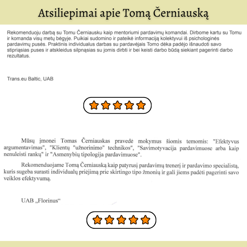 Tomas padės Tau išmokti kalbėti taip, kad klientai patys norėtų pirkti. Jo metodai padeda išvengti nemalonių derybų, baimės kalbėti apie kainą ir „pagalvosiu“ tipo atsakymų.